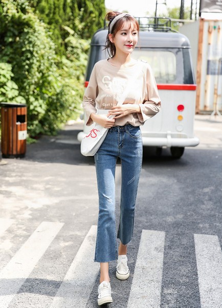 09 目前最流行的牛仔款式中的一种,关键在于九分长度与喇叭廓形,经典百搭又具复古的时髦特征,呈现婀娜腰臀、专治腿不直或小腿粗及突出纤细脚踝是它的优势所在,因此比紧身裤更受欢迎。