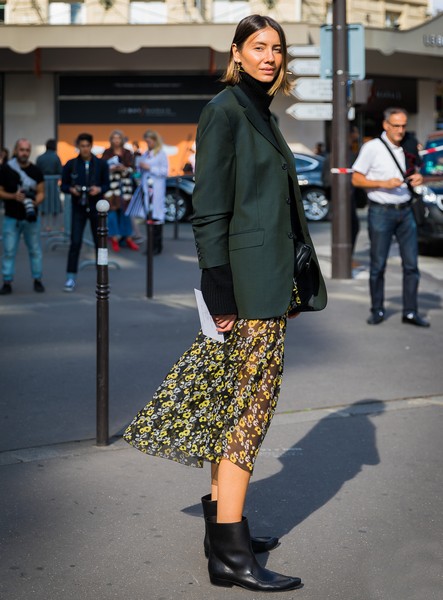 Julie Pelipas,深绿西装+黑色高领衫+印花半裙+黑色切尔西靴,轻盈亮丽的印花薄纱半裙一扫深色造型的沉闷,浪漫又有气场的OL风,很适合过渡季节。