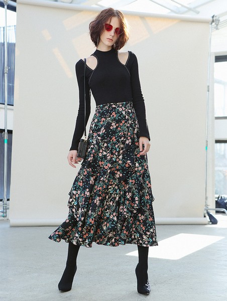 01 印花满到溢出来是2018春季的印花潮流,加上层叠大荷叶边裙摆,浪漫摇曳风情万种,黑色为底可以清新妩媚也可以冷艳帅气,前者配简约单品不难实现,后者可用帅气硬朗黑色与皮质单品来增添气场。