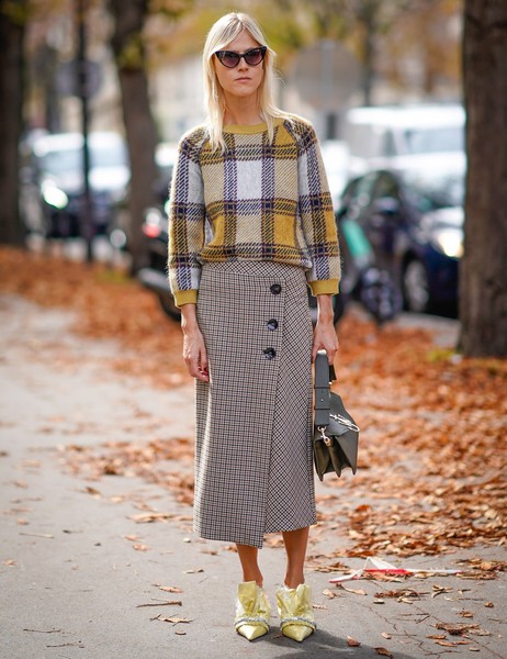 Linda Tol,大格纹毛衣+小格纹围裹半裙,两种格纹统一黑白黄配色,配饰呼应整体,整体到细节都很有特色,合身版型+高腰线凸显高挑比例。