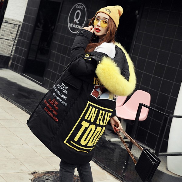 04 时而率性活泼,秉承着玩转街头风的原则,誓要将撞色进行到底。罕见的明黄色毛领,配合大面积的明黄色字母,中间还夹杂着可爱到无法用言语来形容的卡通图案,不经意间就把黑色的底色衬得生动起来了。