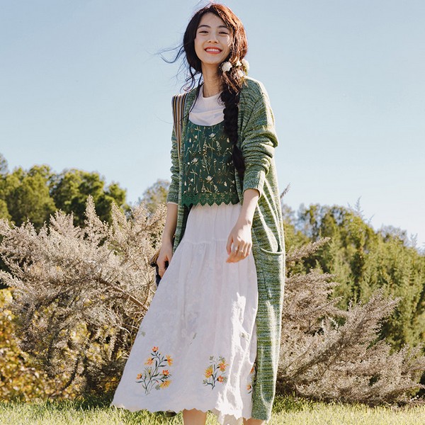 04 斑驳的草绿混色针织有着春色离披山野烂漫的即视感,抽象而耐看,有层次感的绿白蓝组合,可以作为的色彩延伸,凸显清新怡人的自然美感,长衫配长裙则显仙气飘飘。