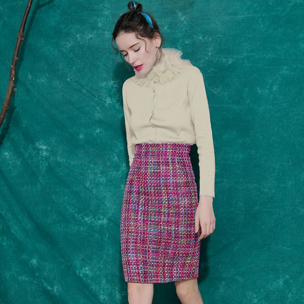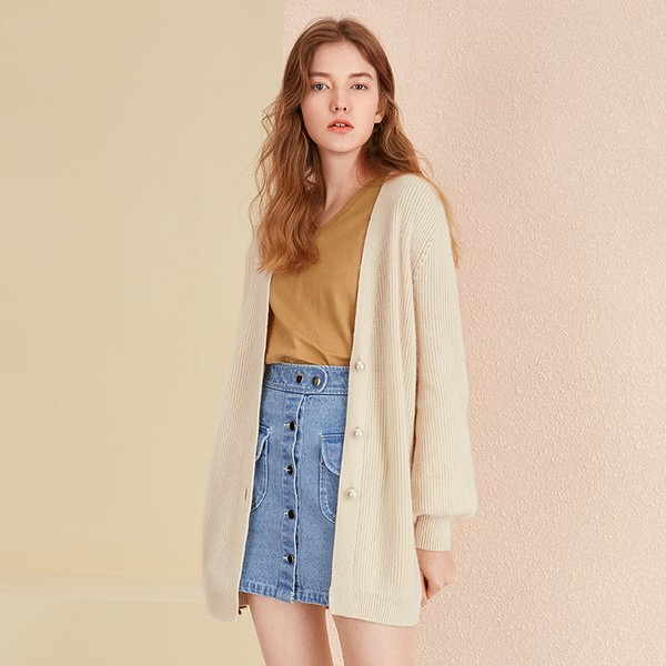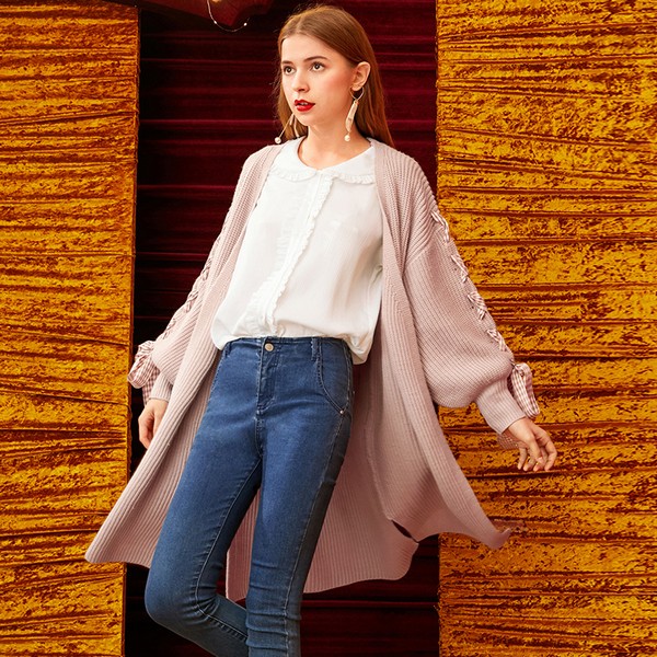 02 开衫之所以显瘦在于利用垂坠开衫形成狭长的纵向分割,而中长款将此优势放大,与肤色接近的米色显温柔气质,用有色内搭强化色块分割,使横向和纵向都能达到理想效果,灯笼袖和珍珠扣还能提升细节质感。
