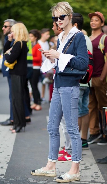 Sasha Luss,深蓝短开衫内搭白衬衫穿着,露出白色领部与袖口非常清新,下穿紧身牛仔裤和渔夫鞋,勾勒美腿线条,舒适而接地气。