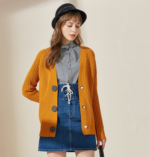 09 简洁开衫不仅可以用针织纹路来丰富细节,还可以挑战大胆的色彩,温暖浓郁的铁锈黄色不仅显肤白还能给造型增添个性的一笔,除了配顺色、不出错的无彩色,和蓝色这组对比色CP轻松营造惊艳感,外置大圆扣萌趣可爱,内置金属暗扣开合快捷省事。