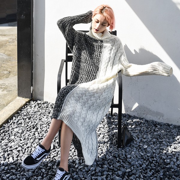 07 如果从打底的角度跳脱出来,那么宽松的针织连衣裙会给你机会造就时尚经典。粗线麻花的清晰,黑白夹花的拼接方式,将宽大的个性完全彰显开来,随和的线条才是慵懒最看中的故事。