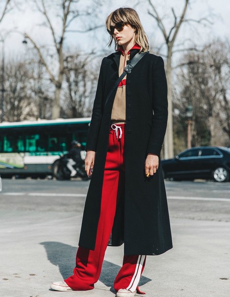 Camille Charrière,保暖舒适的羽绒服和皮裙分别属于不同的红,一个偏橙红青春耀眼,一个偏酒红高贵优雅,红白拼色包包分别与半裙和帆布鞋相呼应,打底裤保暖过渡,短款羽绒服和短背带,不遗余力显高瘦。