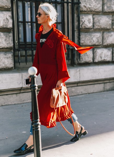 2017春夏巴黎时装周,休闲正式皆宜的红色连衣裙美得彻底,荷叶边与飘带元素更添浪漫优雅,内搭休闲字母T与,不同风格碰撞提升潮流指数,乐福凉拖将轻松舒适升级。