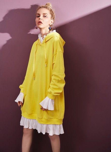 03 当荷叶边喇叭袖和褶皱结合在一起,视觉效果更佳明显,更何况还有撞色作伴。卫衣式的成长速度远远超出了我们的想象,它毫无芥蒂的融合各种元素,迅速的在风格万千的穿衣打扮中占据一席之地。