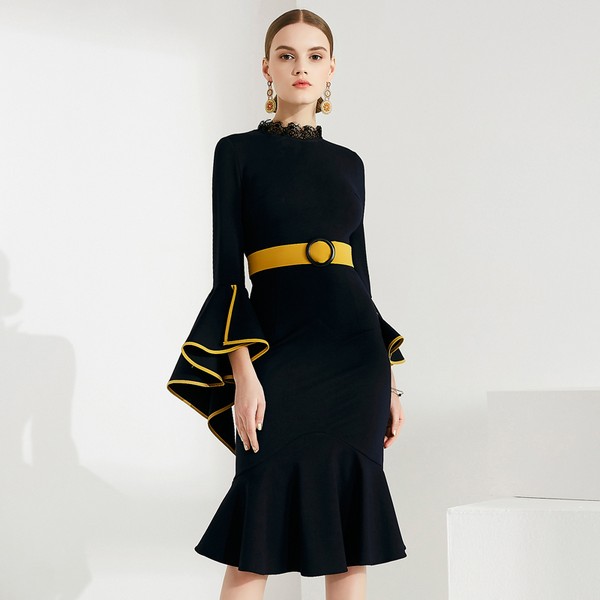 04 有些女人味的霸气是难以用语言去描摹的。喇叭袖,鱼尾裙摆摇曳,原本可以是甜美可以是性感的连衣裙却在色彩的组合中呈现一种独特的霸气,不那么凌厉却让人过目难忘。