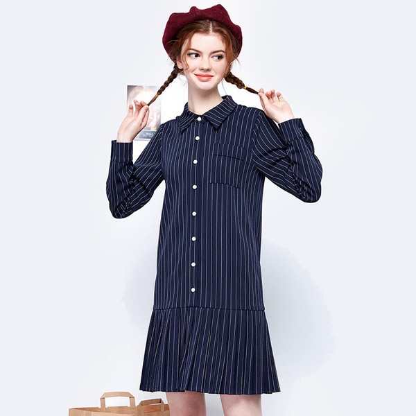 08 同样是蓝与白的碰撞,深蓝显得不够清新,但至少还有清新的可能,细条纹的勾描让你无法拒绝。翻领百褶裙,腰线的放低成全了直筒裙的潇洒,没有曲线美却多了几分青春的姿态。