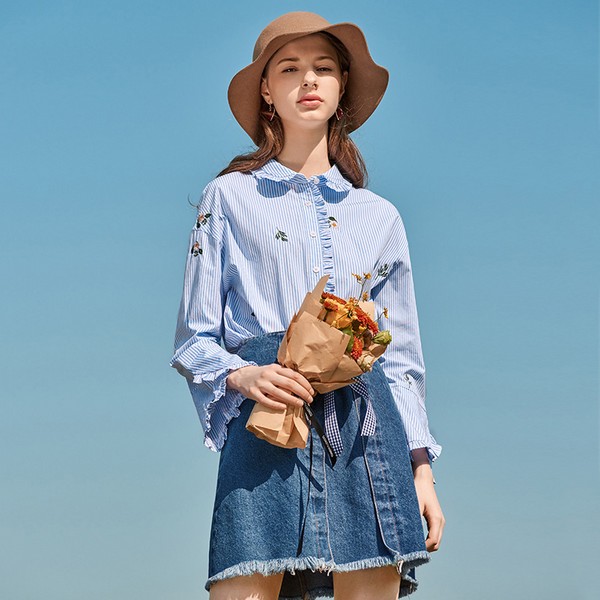 07 经典的海军风蓝白条纹绝对是条纹中的战斗机,无论怎么变那份惬意与自然的状态都不会减少。荷叶边的甜味蔓延在衣领门襟和喇叭袖上,刺绣的精致错落有致,这样的衬衫春天为什么不爱呢?