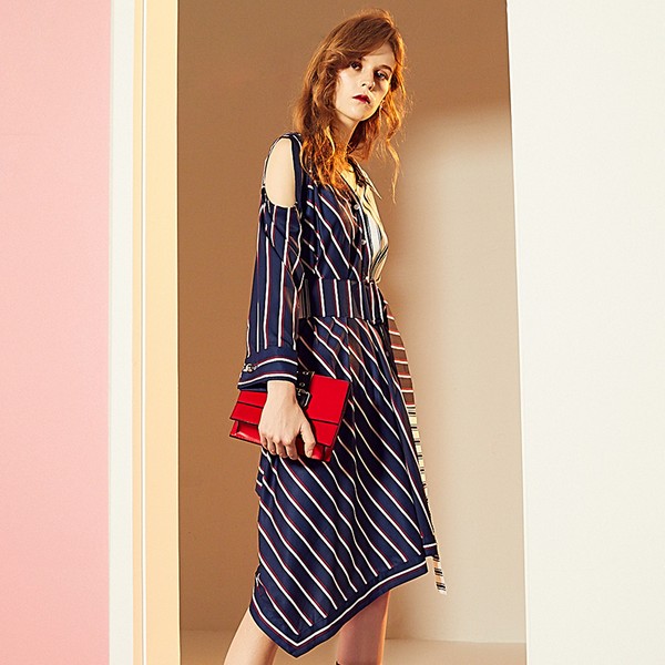 09 条纹的性感来自露肩的诱惑,不规则剪裁加上条纹撞色,视觉上的饱满冲击着时尚的限度,给你意想不到的拼接方式,成全你更为丰富多彩的春日华彩。