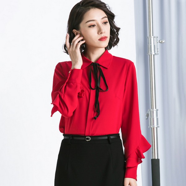 04 稍微放得开一些,可以选择风格偏轻熟的衬衫,不用太严肃,只要能突出女人独有的韵味就够了。大红色的系带荷叶袖衬衫就不错,举手投足间,风情毕现,娇媚由内而外的渗透出来,挡都挡不住。