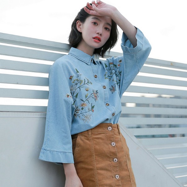 05 区别于娇媚的大红色衬衫,牛仔衬衫属于乖巧型,毕竟,受众大都是还没有走出校园的学生党,想夸张也夸张不起来,与其全方位发展,搞得不伦不类,倒不如老老实实的走的路线,没准儿还能收获点儿意外的惊喜。