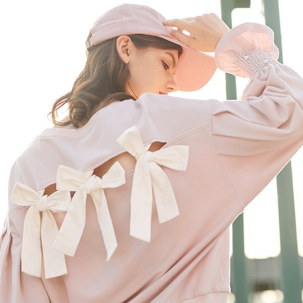 03 粉色加上蝴蝶结大约是我们所能想象的最好的甜美姿态吧。虽然卫衣的个性比较洒脱比较随意,但点缀的位置实在巧妙,后背的风情并不能掩盖整体的舒适,而色彩就是最好的平衡。