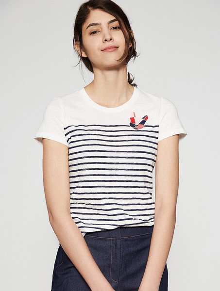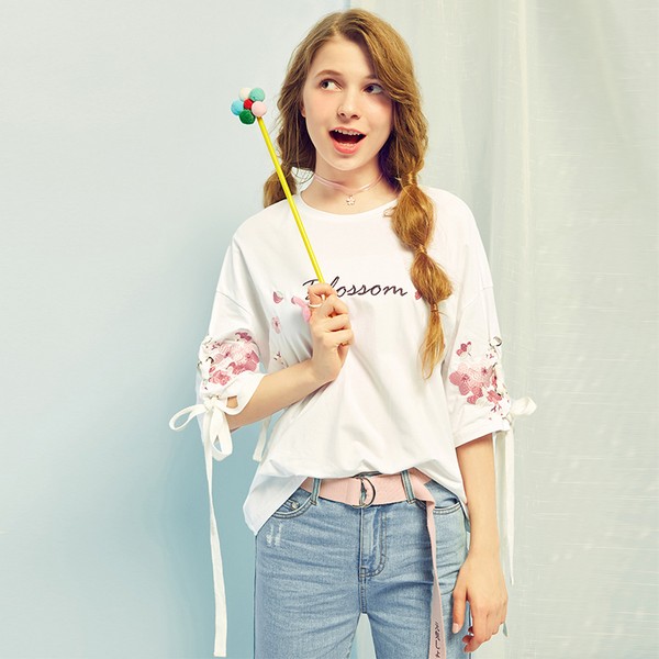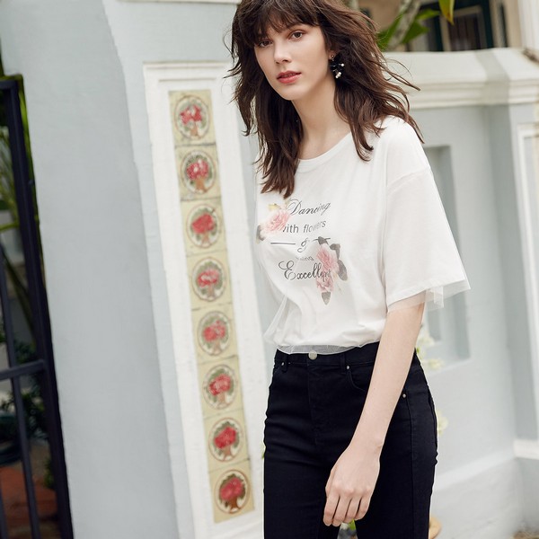 01 随着春夏的到来,T恤逐渐完成从配角到主角的身份转换,在易搭的基础上加一点潮流元素也渐成主流趋势,这件融入了淡彩花朵、字母与薄纱,清新轻盈美不胜收,清爽浪漫符合春夏需求。