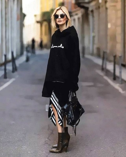 Lisa Hahnbueck用黑色中长卫衣搭配不规则条纹半裙,打造富有细节感的同色系造型,模糊腰线重心下移显随意舒适,再结合不规则裙摆的别致韵味,符合轻松时髦的新趋势。