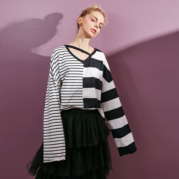 06 这件创意条纹T恤融入了多个流行元素,比如不对称拼接、廓形超长袖、镂空V领等彰显个性独特,Oversize素色款不挑身材与搭配,真正做到随便穿任意搭都是焦点。