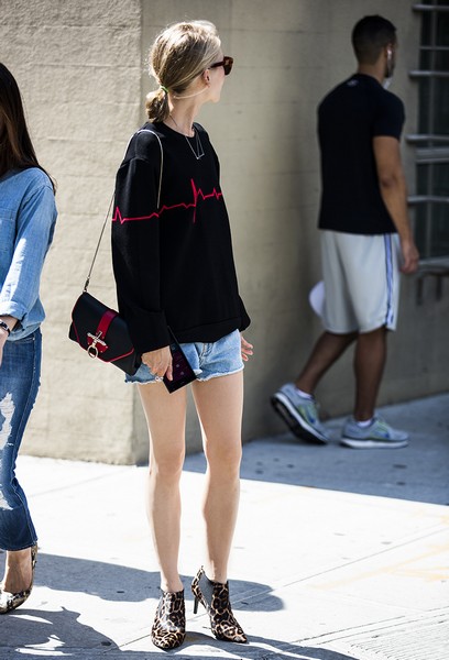 Jessica Minkoff心电图印花和包包同色呼应,下装配牛仔热裤豹纹短靴穿着凸显修长美腿,整体非常酷,这样造型很适合乱穿衣的过渡季。