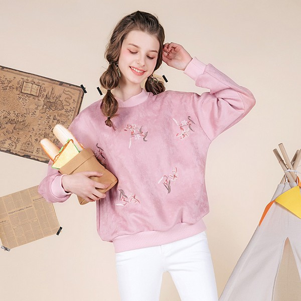 08 简约基础的圆领卫衣,用上粉色就能打造少女感,花朵刺绣分散点缀,呼应充满生机的春夏,挺括有型的麂皮绒面料耐穿显质感,也让整体甜而不腻,配白色下装清新仙美。
