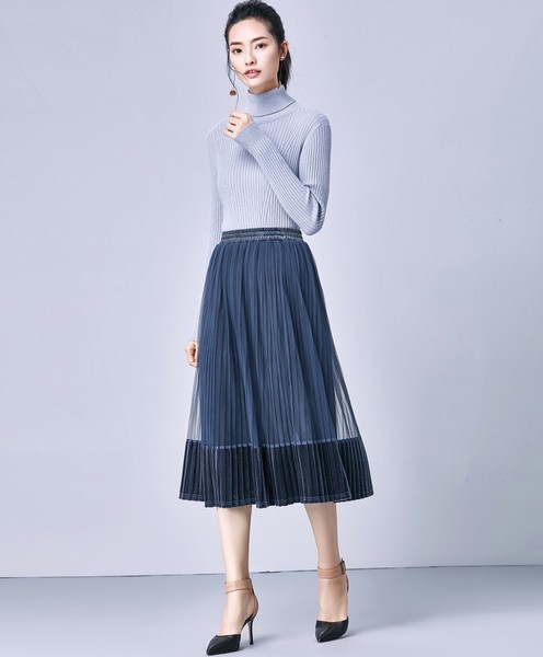 05 每一样材料的流行都会经过改变,所以金丝绒半身裙不在仅仅只是百褶裙的姿态,至少在百褶的基础上做了些许改编。网纱拼接看起来很随意,也给了半身裙很多可能,高跟鞋,只要色彩碰撞出火花就可以搭配。