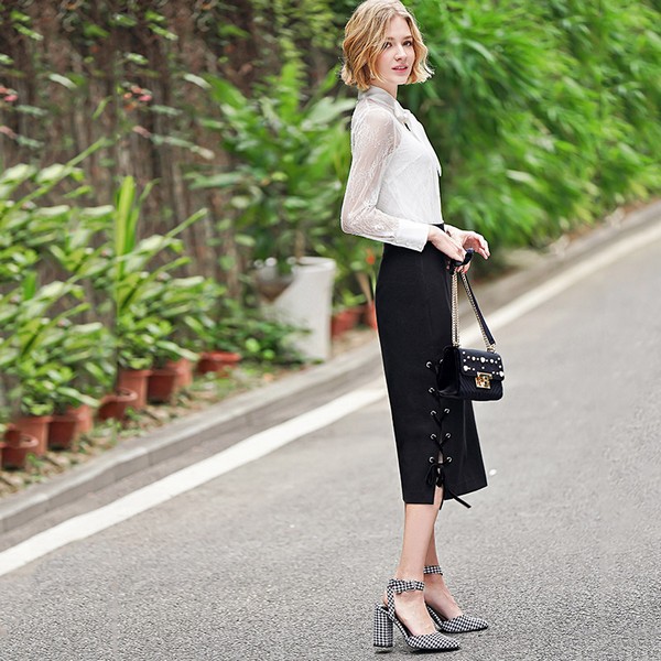 04 想要端庄大方优雅典范,还是包臀裙最给力,不像针织那样对曲线美有严苛的要求,各种细节的出彩也十分抢眼。系带设计减免了高开叉的妖娆感,搭配极简的白也不会觉得太单调乏味。