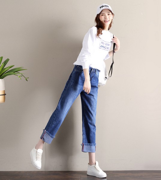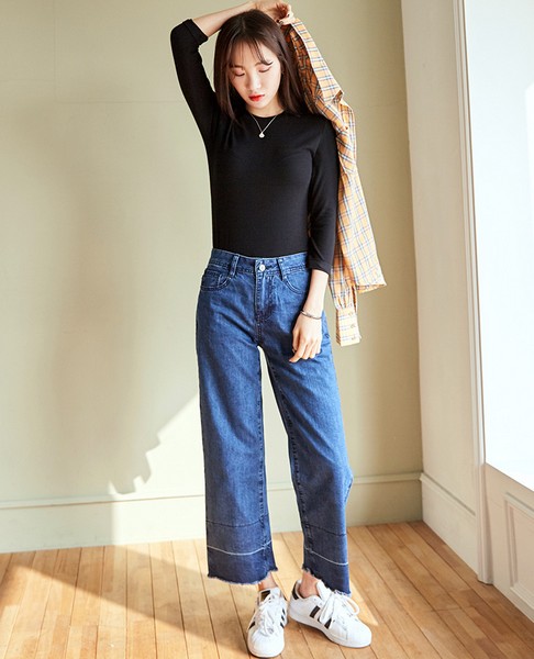 04 比起破坏度高的破洞,毛边似乎越来越受青睐,腰部和裤脚均有毛边细节,看上去层次立体又软萌可爱,同时高腰线和细脚踝被重点强调,进行基础搭配时也不会黯然失色。
