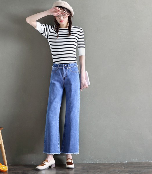 裤脚带有层次渐变的蓝色条纹,使简单的阔腿裤丰富灵动起来,八分裤长加上高腰线与高跟鞋,比例与气场直线上升。