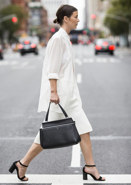 实用收腰:Ece Sukan,西装领束腰衬衫与同色开叉半裙成套穿着,一身纯白职业感装扮很显气质与质感,尖头高跟鞋、亮色包包也点缀得恰到好处。