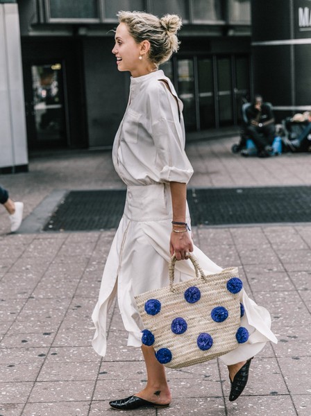 低调露肤:背后开缝露背不仅凉快,也是意外的时髦,这样的性感低调不作妖,与开叉裙摆还能前后呼应,一身白色清新舒爽,加上草编包和穆勒鞋,chic度假风让人艳羡。