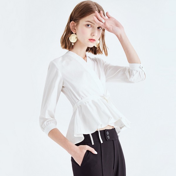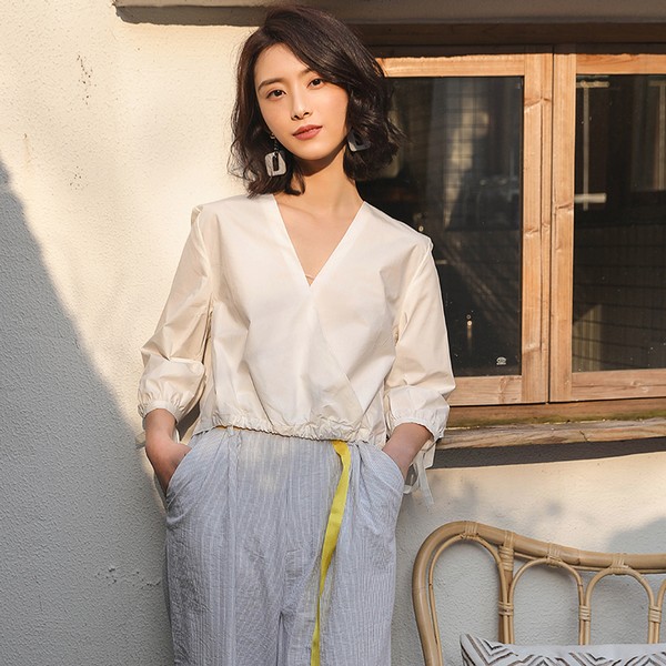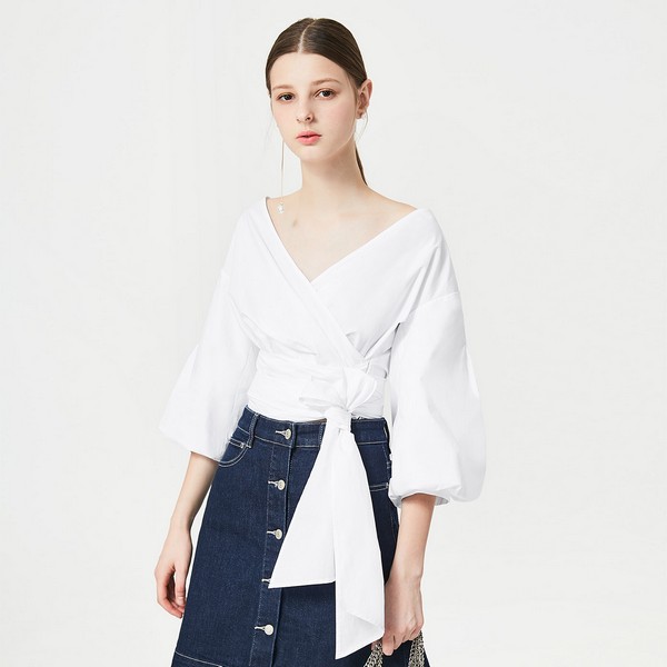 03 这件绑带围裹上衣很显气质,深受达人们的喜爱,V领可以自由调节,露不露肩自己做主,绑带收出优美的身材线条,绑出什么样的花样也随自己手艺,灯笼袖浪漫,白色款让造型变得时髦又仙美。