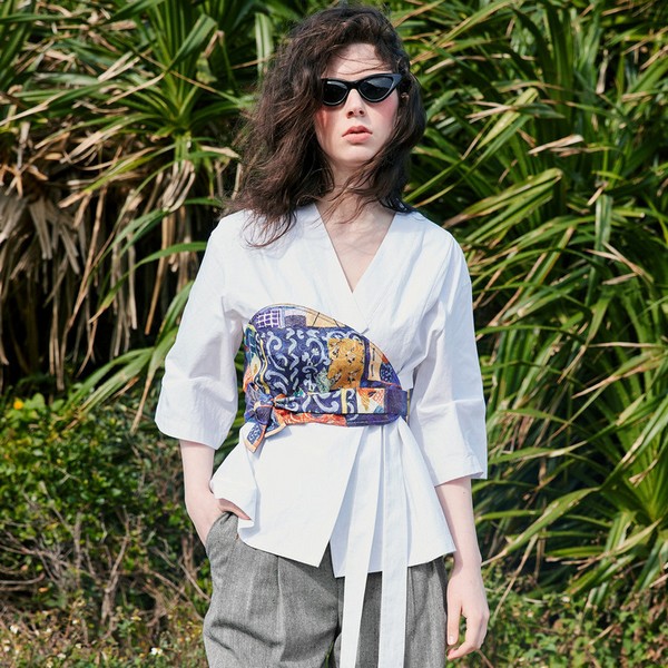 01 绑带裹胸与腰封有锁定高腰线与性感曲线的双重作用,印花裹胸图案精美个性亮眼,两件叠穿视觉效果强烈显时髦复古范,衬衫单穿是不对称门襟围裹系带效果,长度及臀可遮腰臀赘肉,加上宽松衣袖则显舒适慵懒风。
