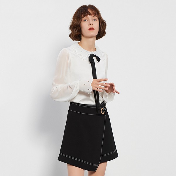 09 白色衬衫加黑色飘带,减龄到高中生的样子,衣身有柔美浪漫的V形拼接,衣袖肘部也有小面积拼接来呼应,显瘦的同时增添优雅气度,配短裙很显俏丽活泼,加入通勤搭配打造气质淑女范。
