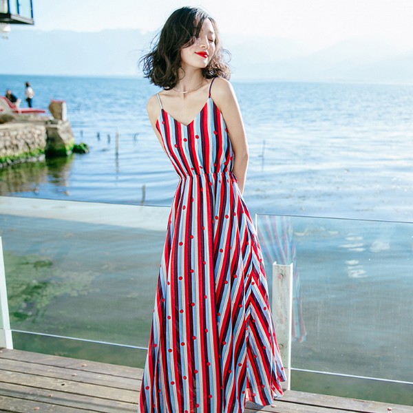 06 由红白蓝黑四个颜色组成的条纹吊带裙,简直就是一个为了上镜而上镜的存在,加上若隐若现的装饰,整体都透着一股非同凡响的高级感,腰细腿粗的女人一定不能错过,超遮丑。