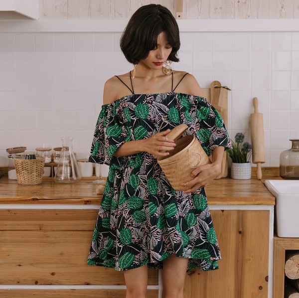 03 自带吸睛效果的一字肩连衣裙,每一个细节都透露着心机,即便如此,也没有半分越矩之感,尤其是白底红花的设计,分外生动,恍恍惚惚还以为是哪里的特色服装呢,妩媚并小清新着。
