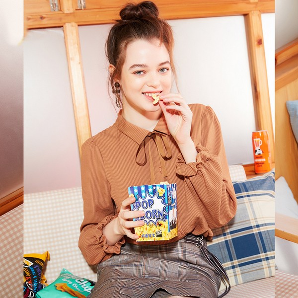 05 如果要靠近职场的话,翻领利落的形象还是有好处的。木耳边喇叭袖的甜美只是点缀了不一样的都市丽人。条纹的经典和色彩的别致搭配的如此之好,蝴蝶结绾系出烂漫姿态,一面优雅一面清新。