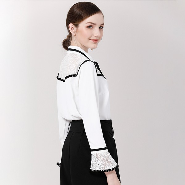 04 翻领中最为减龄甜美的当属娃娃翻领,但对于一件已经有了喇叭袖荷叶边点缀的白衬衫来说,甜美元素已经足够,就要避免娃娃翻领的出现。选择不那么甜美的翻领也许更能彰显一种气息。