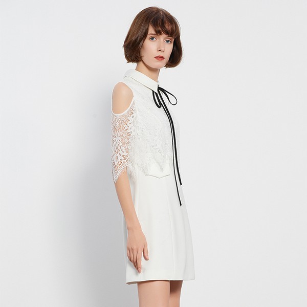 07 直筒裙的窈窕全在线条的利落上,露肩不性感,是因为蕾丝拼接充满了诱惑力。黑白碰撞不再凌厉,小翻领和蝴蝶结的碰撞比甜美更自然一点,因此得名,纯白的底色似乎有着无限可能。