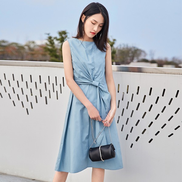 09 衣身前侧活页穿过腰袢打成个性结饰,改变整体结构,形成不规则美感,收出纤腰好比例,视觉亮点突出,其它保持简洁干净,温柔质感的雾霾蓝,是夏日一道悦目的风景。