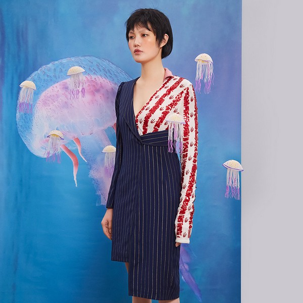 11 两件并作一件也是解构的一种,“乱穿”的深色条纹西装与亮片内搭的假两件组合,两个部分平分秋色各有看点,亮片部分以色泽、形态、内涵取胜,西装部分色调沉稳来平衡跳脱的设计,重组后乱中有序,显得很有故事和个性。