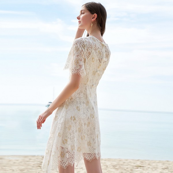 04 加入金丝的双色花朵蕾丝视觉精致唯美体验爽滑舒适,缎带蝴蝶结点缀在背后小巧可爱,喇叭袖遮肉显瘦,不规则睫毛蕾丝裙摆修饰腿长,打造轻盈空气感,过一个清凉与仙气兼具的夏天。