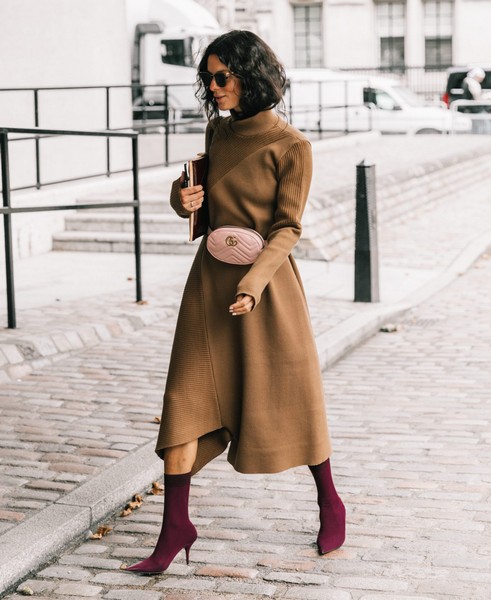 Hedvig Sagfjord Opshaug,驼色针织连衣裙+酒红袜靴,粉色腰包点缀,显得随意洒脱与潇洒,纹路的不同与不规则分片丰富细节强化造型感。