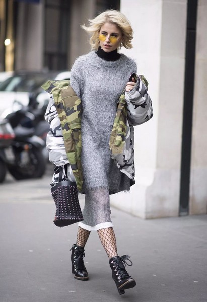 Caroline Daur,迷彩羽绒服+灰色毛衣裙,毛衣裙选择柔软贴身款,外套臃肿也不怕,灰色这个百搭色与各种颜色都能相融,天冷时只需将渔网袜换成基础黑色打底便能显瘦保暖两不误。