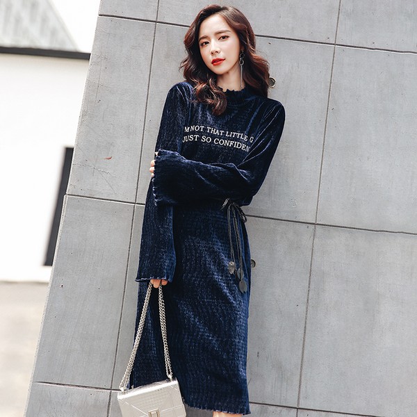 12 潮流范的丝绒连衣裙,较宽松的衣身由系带收腰来控制比例,字母标语为个性态度发声,褶皱肌理丝绒面料闪耀灵动,藏青色像宝石一样华丽深邃,也更加凸显肤色白皙。