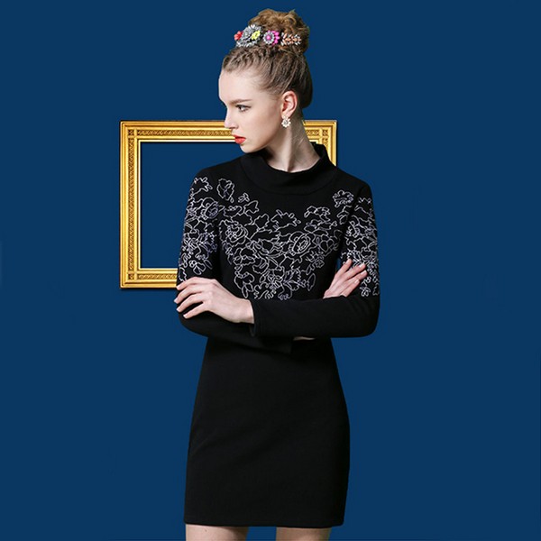 05 同样是黑色的修身打底连衣裙,提花的色彩偏向于简约。纯白线条勾勒出来的素雅,比起色彩繁复的碰撞并不会落败,黑白的大方得体也并不是什么风格都能代替的。半高的圆领设计,可以外穿省却很多麻烦。