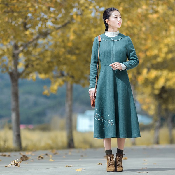 07 毛呢裙的厚度给了秋冬足够多自信的理由,最重要的是厚度之外风度也有了很好的展现。安静文雅的连衣裙风格。娃娃领和收腰设计,有裙摆飞扬的既视感,碎花点缀,更见清新自然的风格。