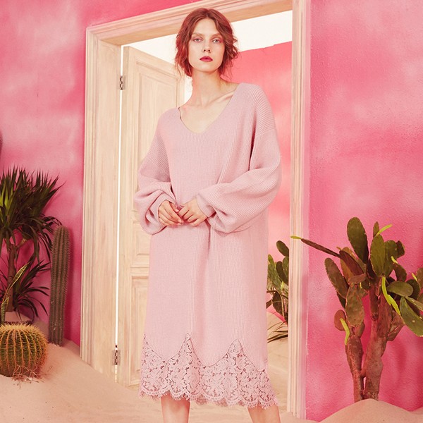 07 女人味和蕾丝往往相关联,但真正的高手都懂得突破自我。所以当你看到针织和蕾丝在一起,你就能知道,蕾丝其实可以更天真一点。灯笼袖,浅粉色,宽松的H形可以收敛很多小缺陷,不是很好么?