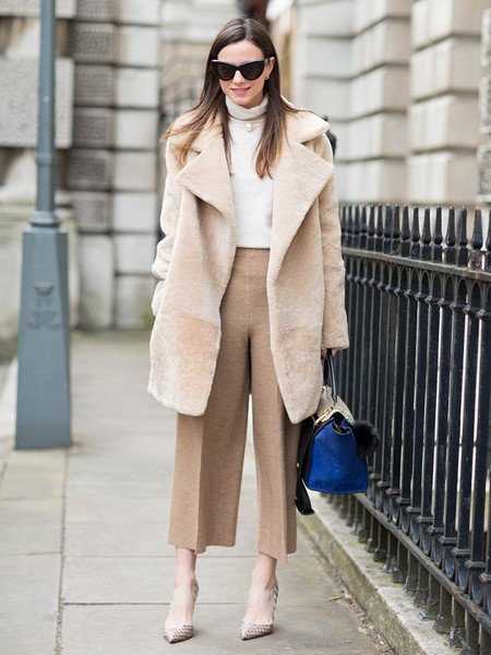 Anya Ziourova,这身白色毛呢斗篷阔腿裤套装气场十足,内搭黑色打底形成错落有致的视觉对比,也突出了的剪裁特色,鞋裤同色露脚踝高腰线都是显高技巧。