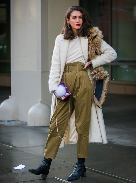 Diletta Bonaiuti,上半身统一白色单侧点缀皮草围巾,下面搭配纸袋裤皮靴,比例划分清晰明了。